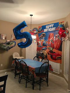 Jonah decided he wanted a race car birthday, so Mommy hooked him up! Daddy had just gone through a little procedure (😉) so we couldn't do anything too active. We decided on a movie day!